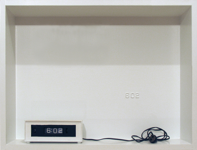 painted wood, clock, plastic numbers, 12" x 18" x 24"